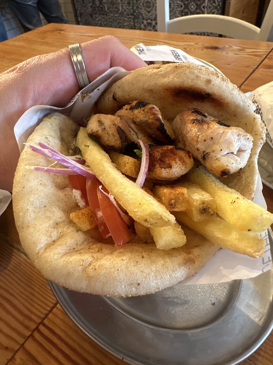 A Perfect Stop on a Hot Day While on a day trip from Cardiff, we stumbled upon The Real Greek—a refreshing find on a warm 27°C day. The restaurant was clean, cool, and welcoming. Service was excellent—friendly staff took the time to explain the menu clearly. The chicken skewers were a standout: perfectly cooked, tender, and full of flavor. Paired with a cold lager, it made for a simple but fantastic meal. Highly recommend for anyone in the area looking for tasty Greek food and great service.